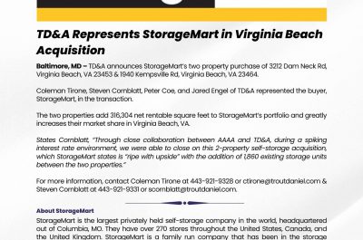 Baltimore, MD –TD&A announces StorageMart’s two property purchase of 3212 Dam Neck Rd, Virginia Beach, VA 23453 & 1940 Kempsville Rd, Virginia Beach, VA 23464. Coleman Tirone, Steven Cornblatt, Peter Coe, and Jared Engel of TD&A represented the buyer, StorageMart, in the transaction. ——————— The two properties add 316,304 net rentable square feet to StorageMart’s… Continue reading›
